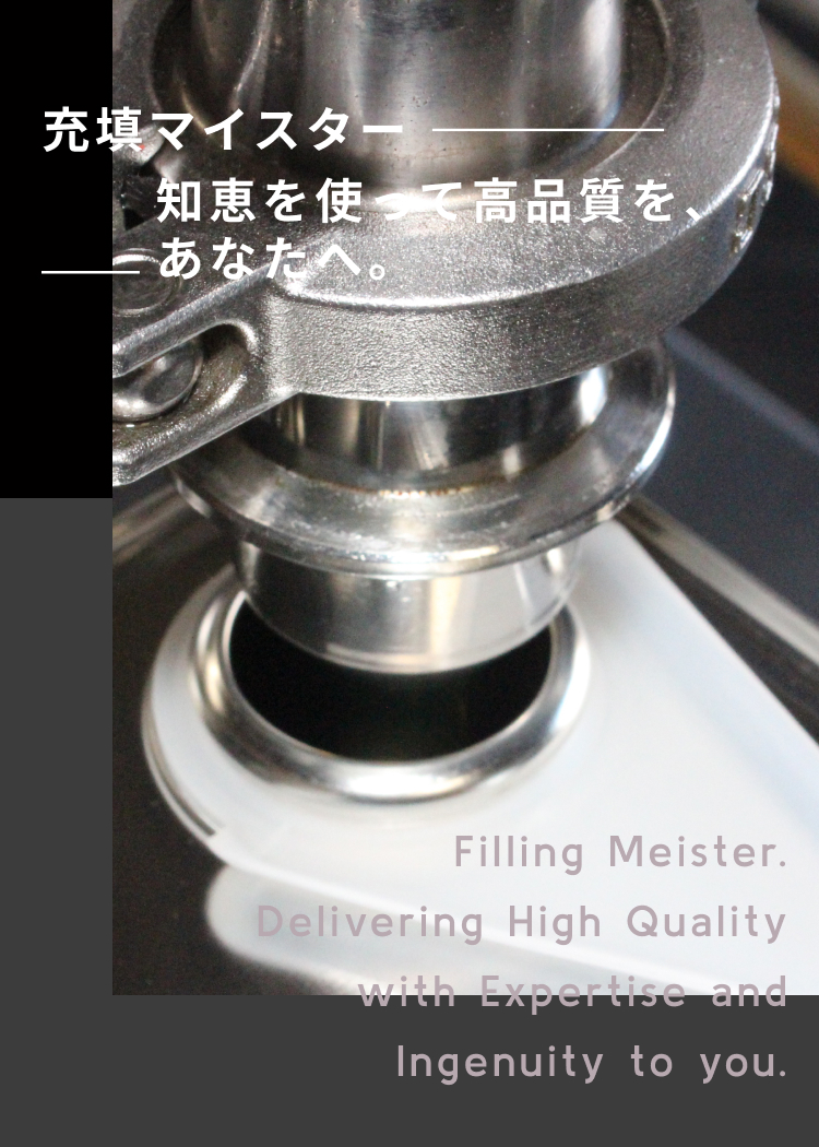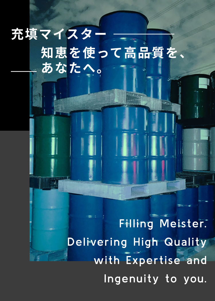 COMPANY会社概要 当社は「充填マイスター」として、高品質・低価格を実現するために、これまで培ってきた知識や経験のすべてを活用して充填を行う工場です。お客様の多様なニーズに応えるべく、一貫生産体制のもと、幅広い業務を行っております。 会社概要 SDGsについて SERVICE事業内容 第4類石油類(エンジンオイルや燃料系・水溶性液体など)のブレンド・製造を行い、各種液体・粉体を さまざまな容器に充填・梱包しております。お見積り・ラベル貼り・ブレンド・出荷など、 充填の事前作業・事後業務もすべて自社で対応しております。 事業内容 FILLING MEISTAR充填について 作業工程一例 充填でお困りの方へ PRODUCT製品一覧 新製品準備中 詳細を見る HYDRO MEISTER 詳細を見る 快適雨戸 詳細を見る